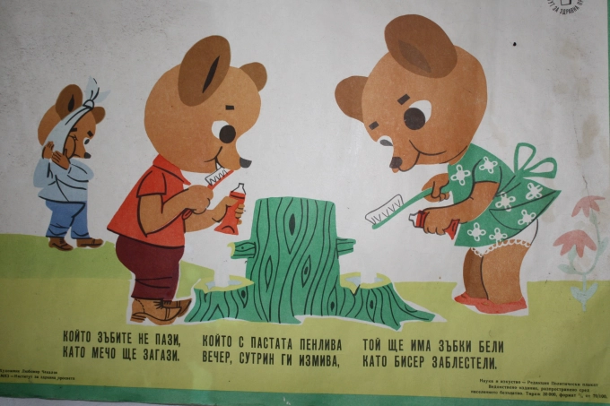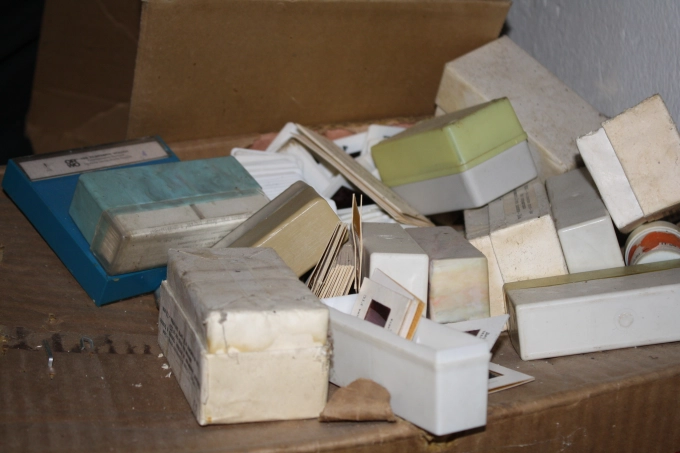 Смутена от разрухата, която се открива пред мен, влизам в първата стая, точно срещу входа. Не разбирам защо е без прозорци, докато не попадам на цял кашон с фотографска хартия, стари филми и два апарата, за които предполагам, че са за промиване на аналогови снимки. И ми става ясно, че това най-вероятно е фотографското ателие на училището, където, предполагам, децата са се учили на фотография, в едновремешните кръжоци. Защо обаче техниката е тук? Разравям малко навътре...цял кашон, пълен с диапозитиви. Тъмно е, едва различавам надписите: „реките в България“, по-долу пише „за 3 клас“. Недоумявам кой е могъл да остави техниката и пособията за промиване на снимки ей така, на нищото. Мисля си, че биха могли да бъдат интересни някъде, където не са и виждали как се промива аналогова фотография. Та това си е музеен експонат, откъдето и да го погледнеш.