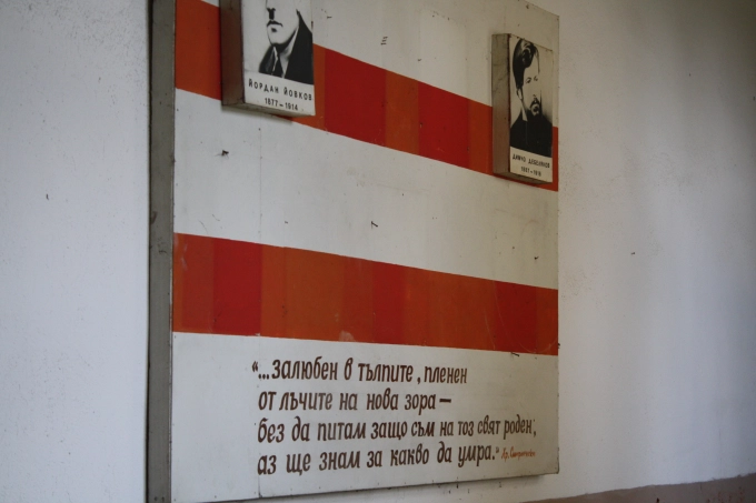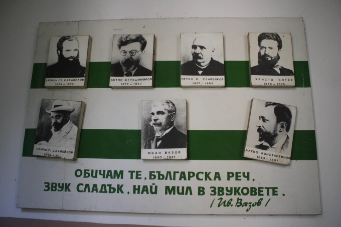 В дъното на коридора на първия етаж таванът е пропаднал. Качвам се нагоре. Посрещат ме класиците. На голямо табло точно срещу стълбите, продължават да висят портретите им. Алеко и Славейков са килнати на една страна, но това е по-малкото зло. По-голямото е, че са оставени тук, в запустялата сграда. Не знам кой е допуснал гаврата с паметта и творческото им наследство.