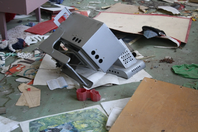 Излизам, ходейки по грамофонни плочи и учебници. Вдигам една плоча – с приказка е. През две стаи намирам и грамофон. Счупен, естествено. Но може да е бил здрав, когато са напускали сградата. Пак се питам как са могли да го изоставят. Този въпрос ще си задам още няколко пъти, докато обикалям изоставеното училище.