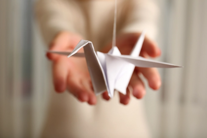 „Сгъването на 1000 жерава има силна символика и връзка с човешкото самоосъзнаване. Всичко започва през 1945 г., когато е хвърлена атомната бомба над Хирошима – действие, променило завинаги съдбите на стотици хиляди хора. По време на бомбардировката Садако Сасаки е на 24-месечна възраст и оцелява по-чудо, намирайки се едва на по-малко от 2 км от мястото, където пада бомбата. За жалост радиацията бавно разбива крехкия ѝ организъм и едва на 12-годишна възраст тя заболява тежко от левкемия и постъпва в болница, където прекарва месеци, докато болестта постоянно се влошава. Садако научава легендата за 1000-та жерава от своя приятелка и започнва да сгъва жерави с желанието да оздравее. Младото момиче сгъва прилежно всеки жерав, а след като хартията ѝ свършва, започва да сгъва жерави от медицински листовки и дори от картички с пожелания за бързо оздравяване на други пациенти. Тъй като била много отпаднала физически, родителите ѝ я умолявали да престане, но тя винаги повтаряла: “Всичко е наред. Аз имам план.” Разказват, че Садако успяла да сгъне едва 644 жерава, преди да напусне този свят. Била погребана с венец от 1000 жерава, като останалите били сгънати от нейни приятели. Садако осъзнала, че желанието ѝ да оздравее няма да се сбъдне, и преди смъртта си, пожелала нито едно дете по света да няма нейната съдба и написва следното хайку: “Ще напиша мир върху крилете ти и ти ще полетиш около света, за да не е нужно хората да умират по този начин”. Оттогава сгънатият жерав е символ, освен на надеждата, още и на мира“.