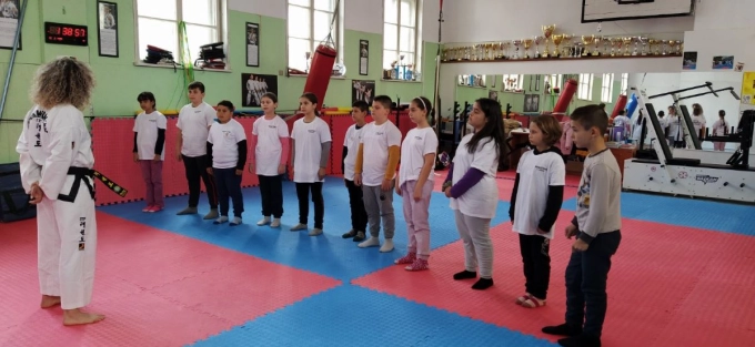 Инспектор Иванова, която е носител на черен колан по таекуондо, започна урока с лека загрявка, след което запозна децата с основни техники за самозащита и водещи ударни техники с крака и ръце.