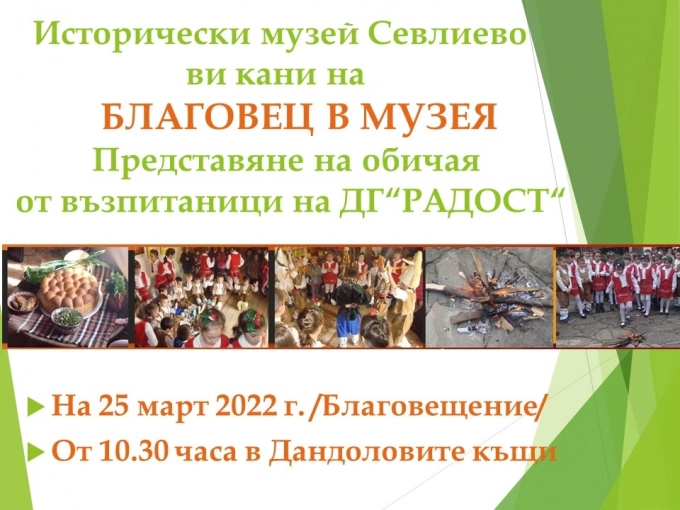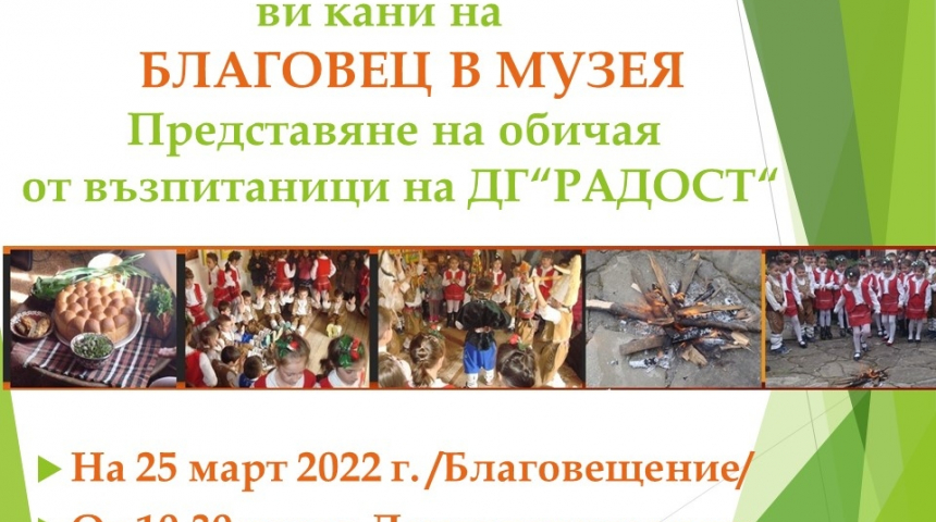 Традиционно на Благовещение деца представят възстановка на обичая. Заради ограниченията покрай пандемията с Ковид-19 възстановките бяха преустановени, но утре, на 25 март, от 10.30 ч. в комплекс "Дандолови къщи", всеки който желае, може да види от първо лице как старите българи са почитали Благовец чрез възстановката на малчуганите от детска градина "Радост".