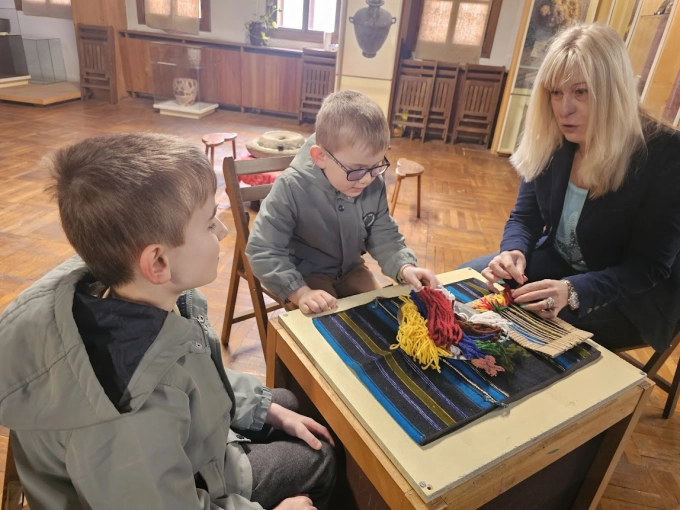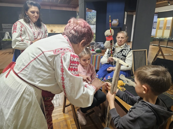 Децата, които днес дойдоха в музея видяха и как се тъче на импровизиран вертикален стан. Да, истински стан нямаше, домакините се бяха постарали да направят подходяща за детски ръце имитация, но процесът от нанизване на преждата, връзването на възлите и притискането им (за това със сигурност има термин, който аз не знам), за да стане платно, може да се изживее само, ако си го направил с ръцете си.