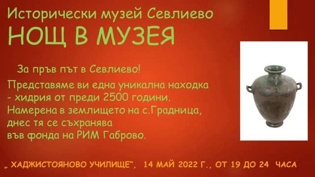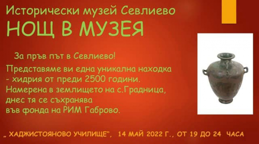По повод Международния ден на музеите на 14 май от 19 ч. до полунощ вратите на Исторически музей Севлиево ще бъдат отворени в рамките на инициативата „Нощ на музеите“. Посетителите ще могат да видят за първи път уникална бронзова позлатена хидрия. Експонатът се съхранява в Регионалния исторически музей в Габрово и ще остане в Музея на Севлиево до 18 май.