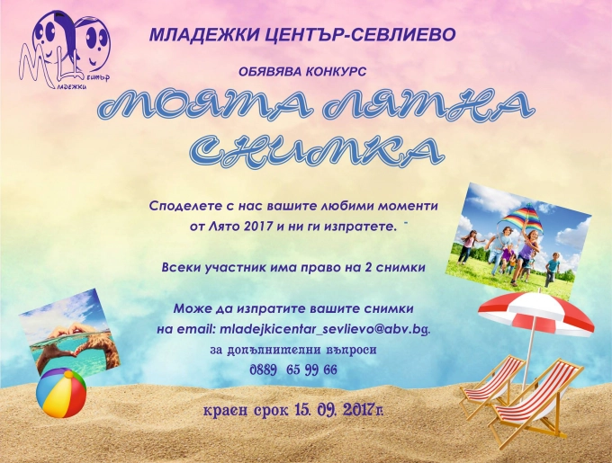Конкурс за най-добрата фотография под наслов "Моята лятна снимка", обявиха от Младежки център Севлиево. Конкурсът няма ограничения относно размера и формата на снимките. Единственото условие е представените фотографии да отразяват незабравими моменти от отминалото лято.