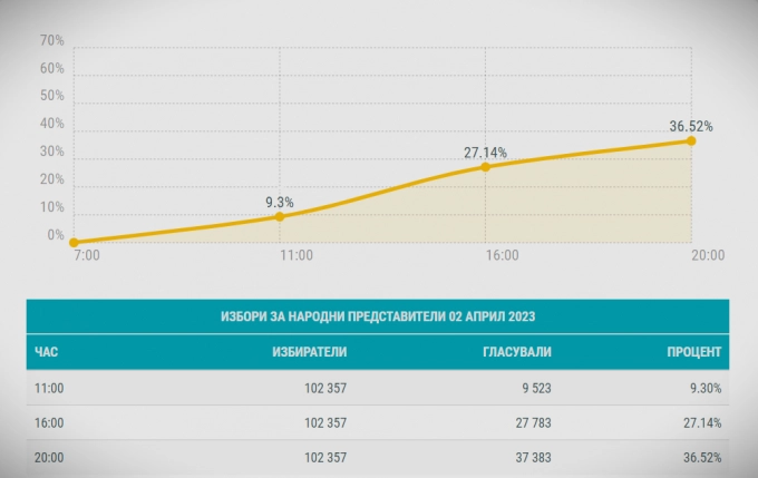 На 2 април 2023 г. до секциите са отишли 36.51% от избирателите в областта. През есента на миналата година това са направили 36.6%. Числата показват, че гласоподавателите на областта са били по-слабо активни отколкото сочат сумарните данни за страната.