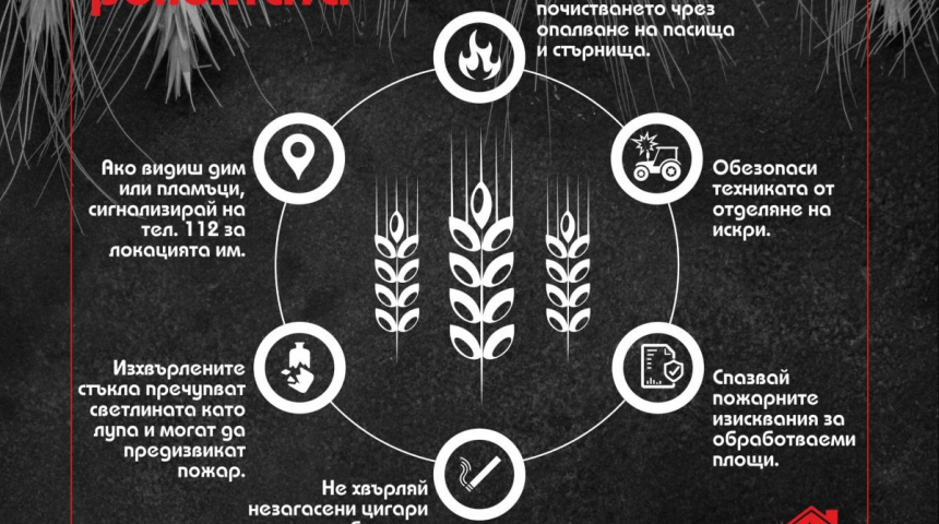 Главна дирекция „Пожарна безопасност и защита на населението“ призовава стопаните на земеделски земи, физическите и юридически лица, участващи в прибирането на селскостопанската реколта, към по-висока отговорност при изпълнение на своите дейности в, или в близост до житните масиви, за недопускане възникването и разпространението на пожари. В жътвената кампания да се използва земеделска техника, която е технически изправна и оборудвана с необходимите пожаротехнически средства за първоначално гасене на пожари.