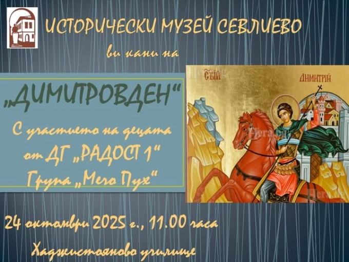 По случай Димитровден от Исторически музей Севлиево организират традиционна възстановка на обичаите за празника на светеца. Тази година възстановката ще представят децата от детска градина "Радост". Всички са поканени на 24 октомври от 11 ч. в Хаджистояновото училище.