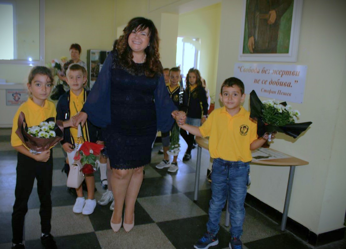Димитринка Стефанова с първокласници на ОУ "Стефан Пешев", снимка: "Севлиево онлайн"
