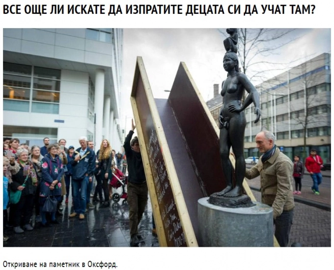 Първоначалната публикация е от анонимен Туитър профил, който вече не съществува, но снимки на оригиналния туит, препубликувани от друг фалшив и вече закрит профил, все още се споделят в социалната мрежа. На 31 май 2022 г. подобна публикация се появява и в българския сайт „Афера Бг“ под заглавие „Все още ли искате да изпратите децата си да учат там?“. Материалът твърди, че това е паметник, който изобразява „съвременната женственост“ и че той се намира в Оксфорд, въпреки че публикуваната снимка е от официалното откриване на скулптурата в Хага и вероятно е взета от сайта на центъра по изкуствата Stroom den Haag. В текста се казва още, че фигурата всъщност представлява езически демон, почитан от тамплиерите. Публикацията е споделена в четири Фейсбук групи, където е достигнала до потенциална аудитория от над 76 хиляди души.