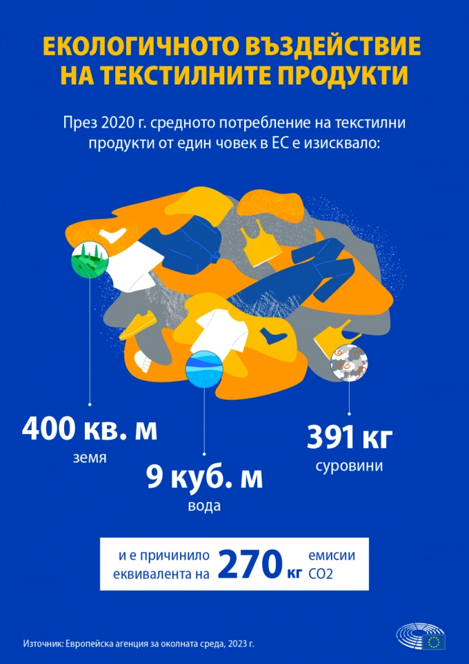 Текстилният сектор поглъща и големи земни ресурси. През 2020 г. производството на дрехи за всеки гражданин на ЕС е изисквало средно 9 куб. м вода, 400 кв. метра земя и 391 кг суровини.