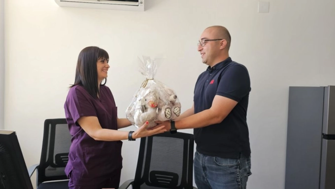Никифор Кънев, представител на "Никипласт-М", остави пакет плюшени мечета за един от педиатричните кабинети