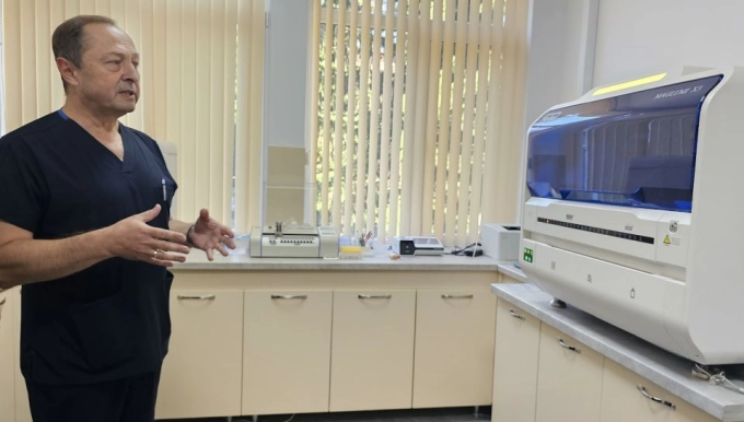 Д-р Пенчев представя имунологичния анализатор, закупен тази година, с какъвто преди години са разполагали само университетски болници