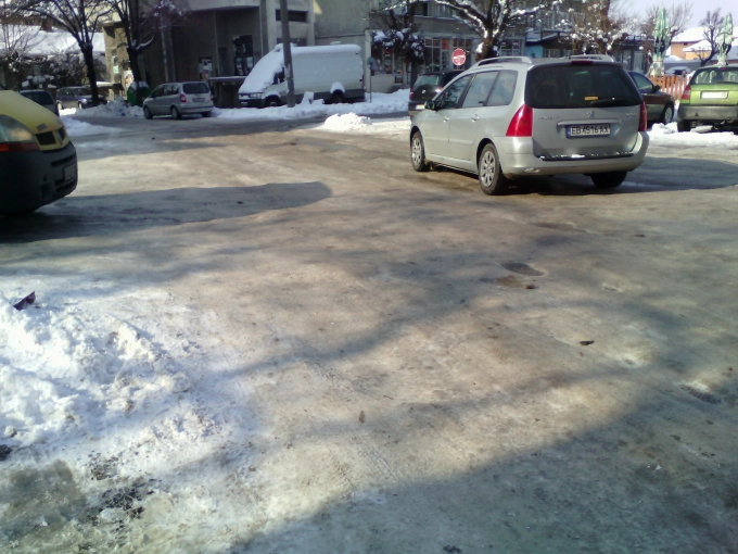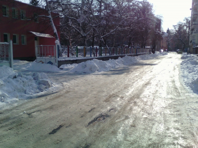 Само слънцето може да почисти улиците в Севлиево от ледовете, в които са сковани. Като се изключат "Стефан Пешев", "Никола Петков" и "Марин Попов", останалите градски улици предлагат екстремни преживявания на всеки, който ходи. Не са пощадени дори тези около детски градини и училища. Няколкосантиметровият лед, получил се след лошото почистване още в първите часове на снеговалежа, вече трудно може да се обработи. На снимка по-долу, направена на улицата, където е главният вход на детска градина "Пролет 2" ясно се вижда, че тук снегоринът не е бил твърде ефективен.