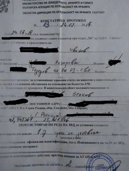 Тогава му казали, че заради нерегистрираното, очевидно вече заклано прасе, ще му бъде съставен констативен протокол, а на 31 юли т.г. трябва да отиде в точно определен час в Областната агенция по безопасност на храните в Габрово, за да получи акт за установяване на административно нарушение. По това време прасето вече било не само заклано, но както казва собственика му, и изядено. Въпреки обстоятелствата той не оспорил действията на ветеринарния лекар и приел констативния протокол.