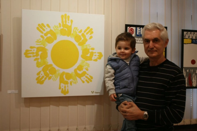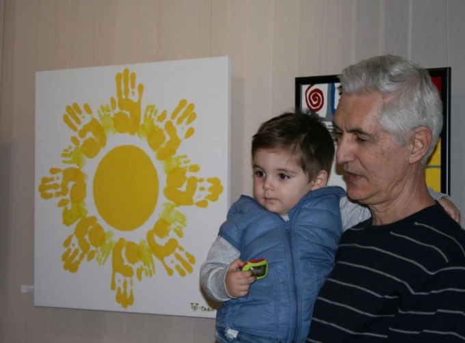 Вижте добре снимката на мъжа с детето. Това са Тодор Тодоров и неговият внук Габи. Днес двамата са главни герои в една история - историята на Тодор Тодоров, продължена, засега бегло, но пък кой знае, от внука му. За целта трябва да се вгледате в картината зад тях. Виждате ли слънцето. Не е обикновено слънце, а отпечатано. Това слънце е нарисувано от отпечатъците на ръцете на дядо и внуче. Усещате ли как грее?