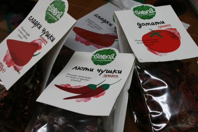 На същия рафт най-отдолу откривам традиционните за това време на годината сушени домати, сушени чушки - сладки и люти.