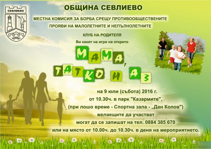 На 9 юли от 10.30 часа парк "Казармите" ще бъде домакин на тазгодишните игри на открито "Мама, татко и аз", организирани от Местната комисия за борба с противообществените прояви и Клуба на родителя. Всички семейства, които желаят, могат да се запишат за участие на телефон 0884 385 670 или на място от 10.00 до 10.30 ч. в деня на мероприятието.