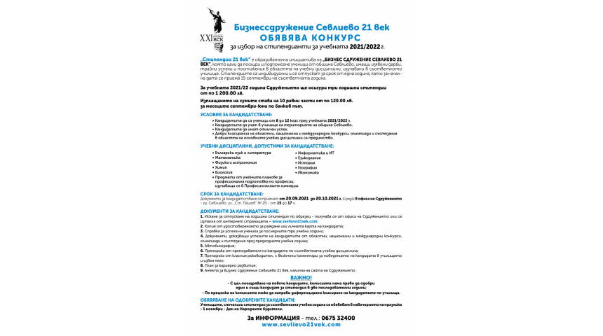 От 20 септември т.г. сдружението на бизнеса "Севлиево 21 век" стартира образователната инициатива "Стипендии 21 век" за новата учебна 2021/2022 година.