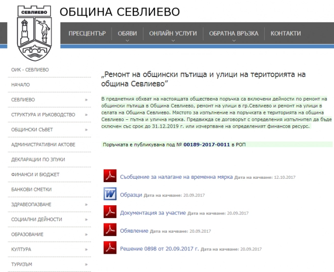 Жалба до Комисията за защита на конкуренцията /КЗК/ от 11 октомври 2017 г. спира временно процедурата по избор на изпълнител в обявената от Община Севлиево в края на септември обществена поръчка за ремонт на общински пътища. Поръчката е за срок до 2019 година, стойността й е 2,5 млн.лв. без ДДС. Жалбата срещу нея е от "Пътно поддържане Севлиево" ЕООД.