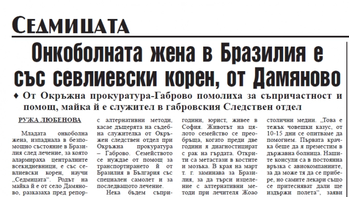 Младата онкоболна жена, изпаднала в безпомощно състояние в Бразилия след лечение по методи на неконвенционалната медицина, е със севлиевски корен, пише в утрешното си издание вестник „Седмицата“. Родът на майка й е от село Дамяново, са разказали пред репортер на вестника запознати. Жената работи в следствен отдел на Окръжна прокуратура Габрово.